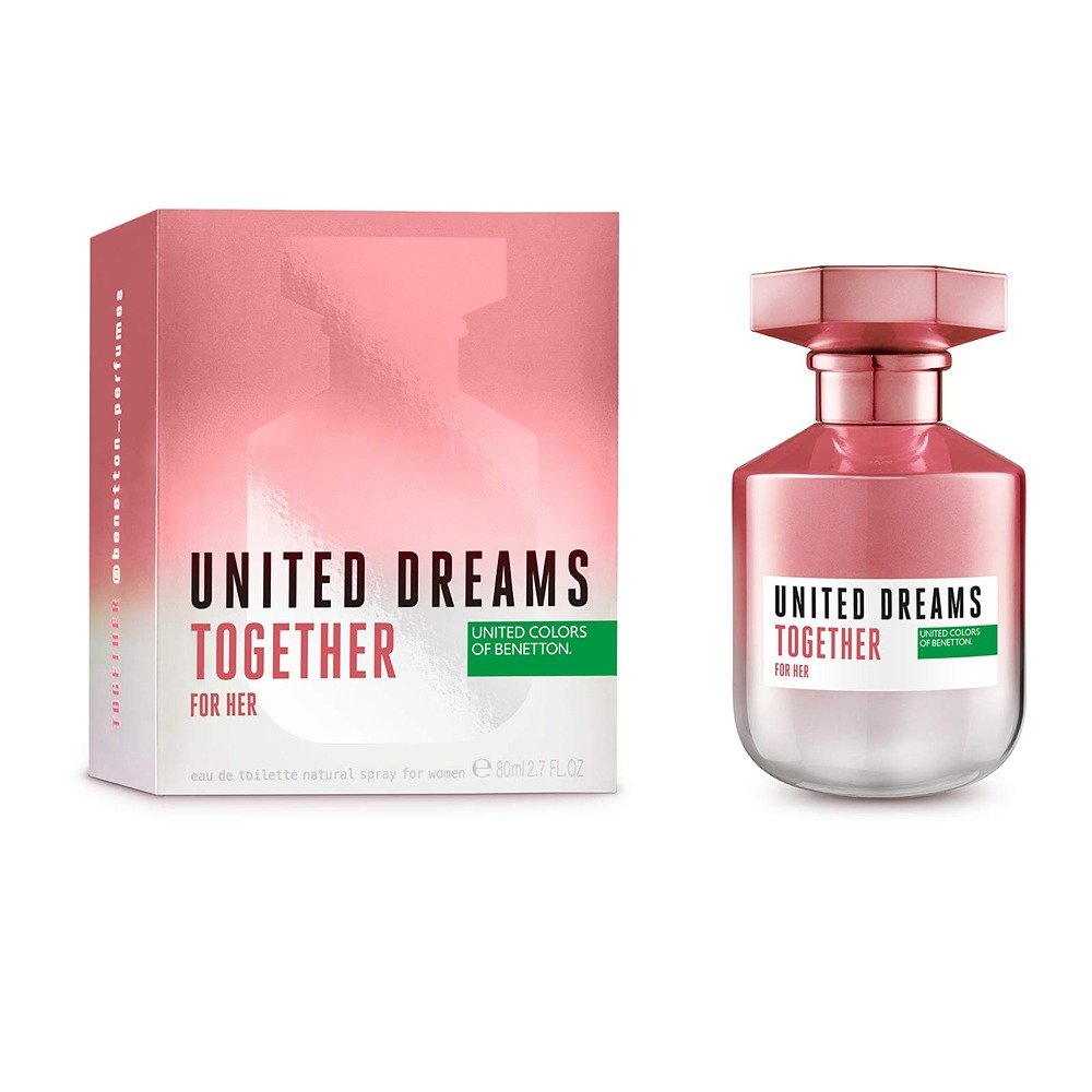 United Dreams Together for Her by Benetton is a Floral Fruity fragrance for women and men. United Dreams Together for Her was launched in 2019. Top notes are Gooseberry, Peach and Bergamot; middle notes are Magnolia, Rose, Pink Pepper and Jasmine; base notes are Vanilla, Praline, Musk and Cedar.